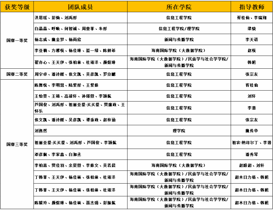 第十三届全国大学生数字媒体科技作品及创意竞赛全国现场总决赛于2025年10月25日在黑龙江哈尔滨举行,在我校教务处的指导下,信息工程学院组织各学院学生积极参赛,最终获得国家级一等奖5项,国家级二等奖1项,国家级三等奖11项,六位教师获得国赛优秀指导教师奖,学校获得国赛组委会颁发的全国优秀组织奖。获奖学生和指导老师分别来自信息工程学院、新闻与传播学院、民族学与社会学学院、理学院、海南国际学院等单位。
